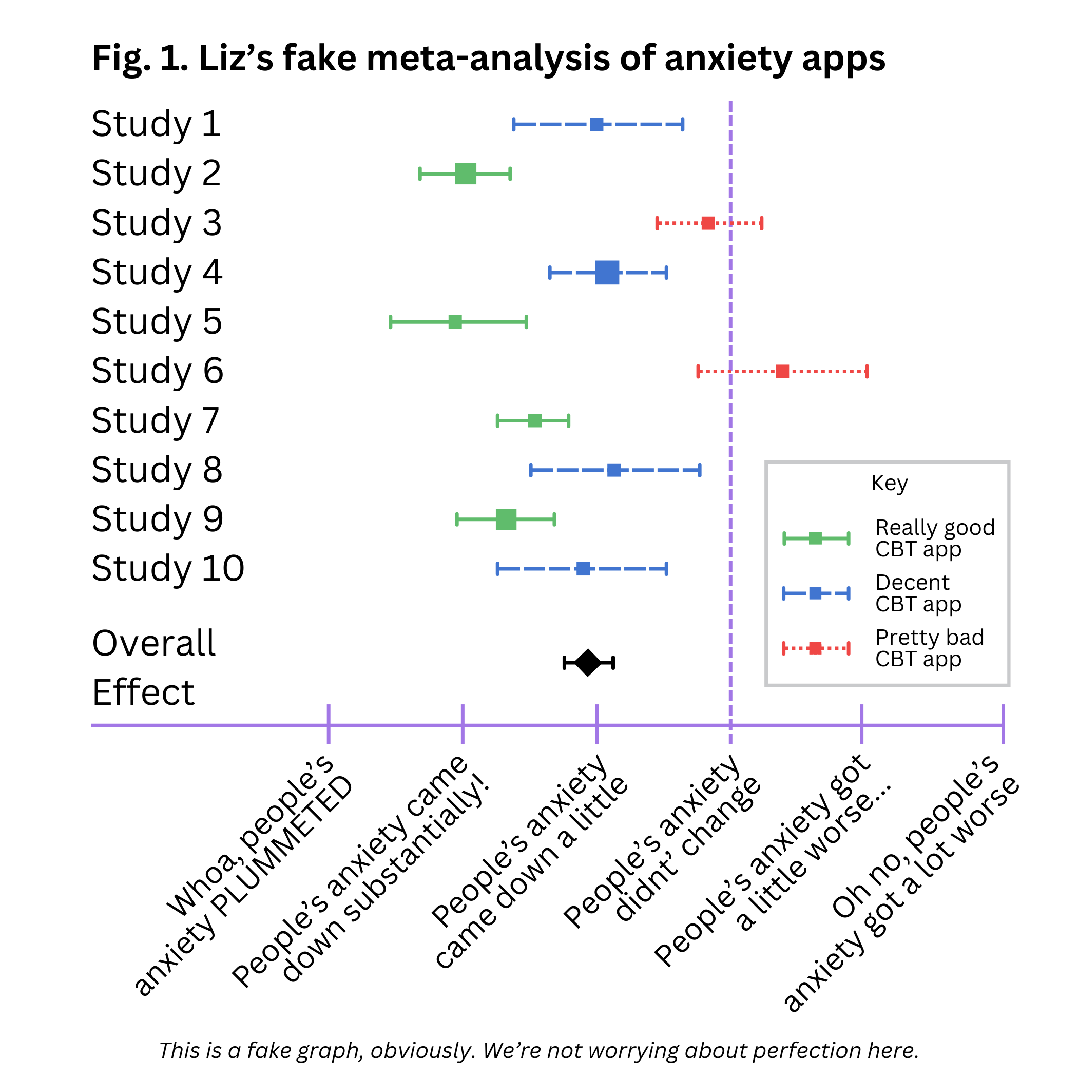 Below is an example of a meta-analysis forest plot. These plots show the effect size of each study (here, how much people’s anxiety symptoms changed as a result of app use), and the weighted average or overall effect.